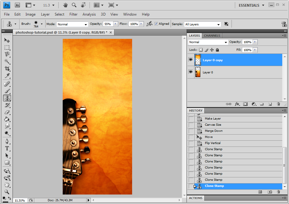 We need to make the top guitar disappear. We do this using the Clone Stamp tool. Choosing a patch of the textured background beside the top guitar as the source, you can paint over the guitar. Again, fiddle with the size, hardness and opacity of the brush to smoothen out the changed region with its surroundings.