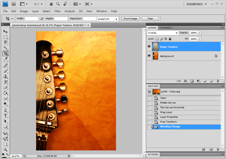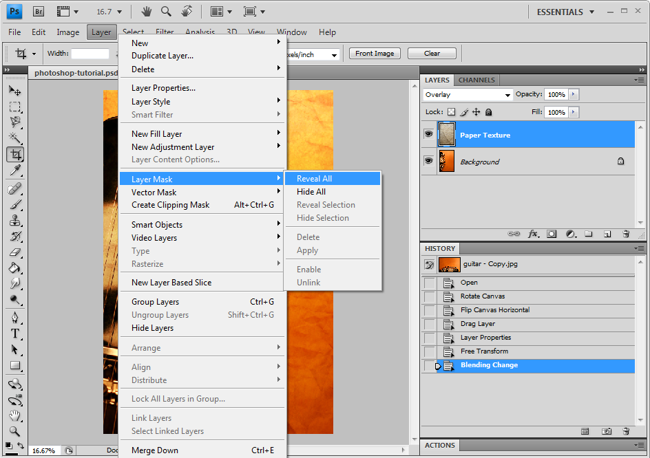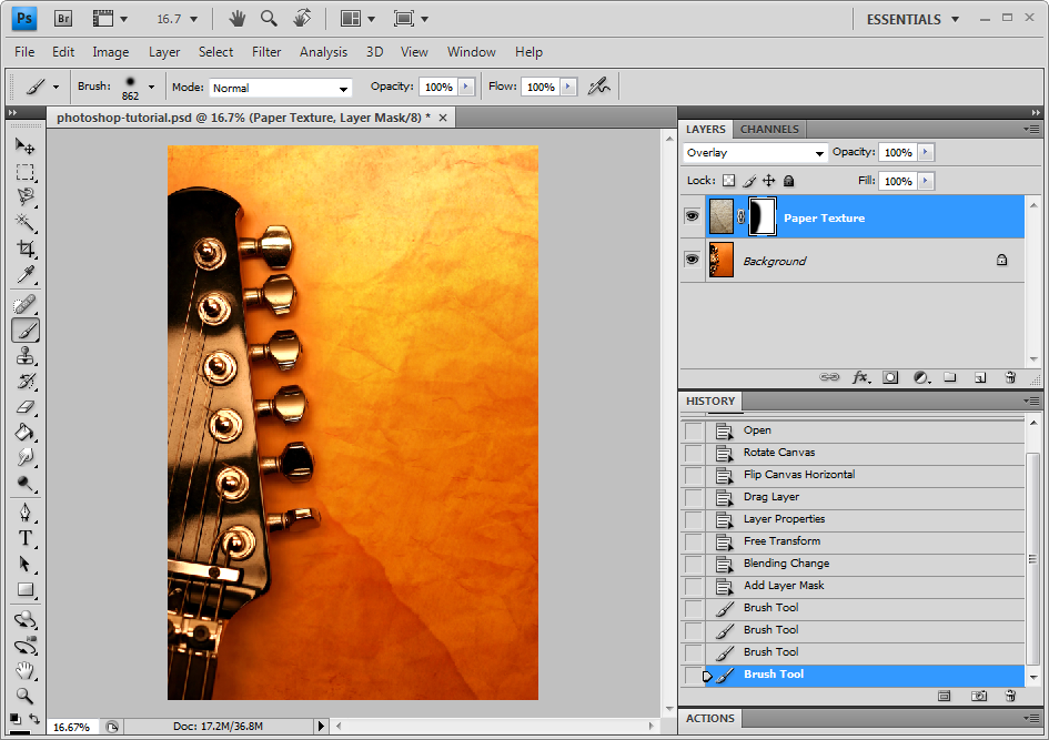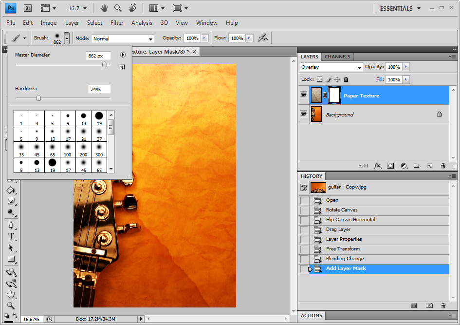 Not quite finished yet. The overlayed texture has fallen on the entire image, including the guitar. Although in this case it is not very conspicuous, I still prefer the smoother, softer original look of the guitar. Also, in other cases it might not do to have the texture sprawl over the entire image, but only lie over a specific area of it. For this we must remove the texture from the unneeded region. This we shall do via a layer mask.