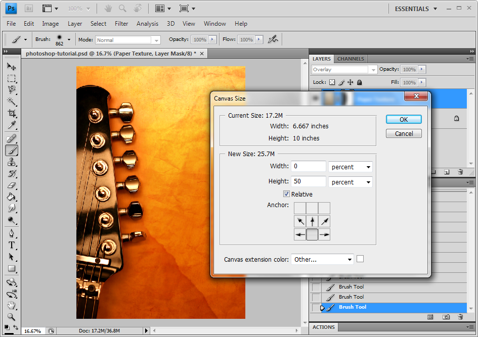 This essentially concludes the tutorial on adding a texture. However, I also wanted to increase the extent of this image upwards, filling the expanded region with only the textured background. For this we must first make a layer from the locked background (the original image) by double-clicking it. Then we change the canvas size by Image > Canvas Size: