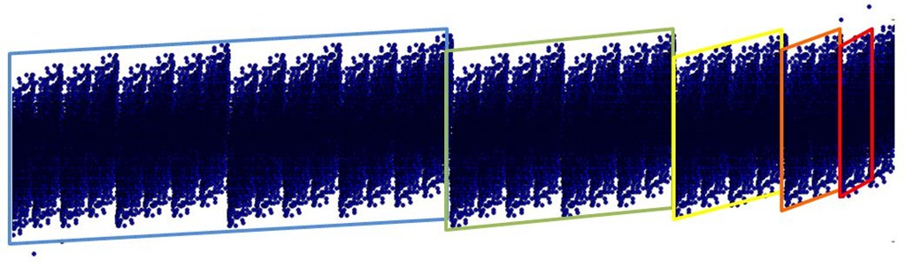 In other words, the point symmetry is repeated on increasingly smaller scales, as it should. The whole bisected nature of the nested intervals is responsible for this. More parallelograms would be revealed if we kept making our resolution finer, and the horizontal extent of these parallelograms are only exhibiting those nested intervals.