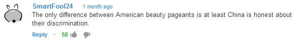 I do not know exactly in which sense the OP meant this comment. Perhaps he/she meant that there goes on unjust discrimination even for American beauty contests, which is never exposed or publicized by the organizing body. However, I choose to believe that they meant something deeper: that every time there is a beauty pageant, anywhere in the world, in any spirit, with any sort of rule or criteria, there is, unavoidably, as a direct necessity of such a program, an evaluation of the bodies of several contestants against some fixed ideals that are either decided in advance or left to a panel of judges. I seriously doubt whether in such cases TV personality Yang Lan (comment 2 in the numbered list) expresses outrage over treating women as toys. Where does she choose to draw the line? Does it even matter where she chooses to draw it? I don’t see anything about hosting beauty competitions to gauge contestants against some pre-decided, inflexible ideals of beauty in our heads as anything short of a nonsensical treatment of humans on the pure basis of their bodies minus the persons they are: exactly what Yang Lan hastens to call a ‘toy’.