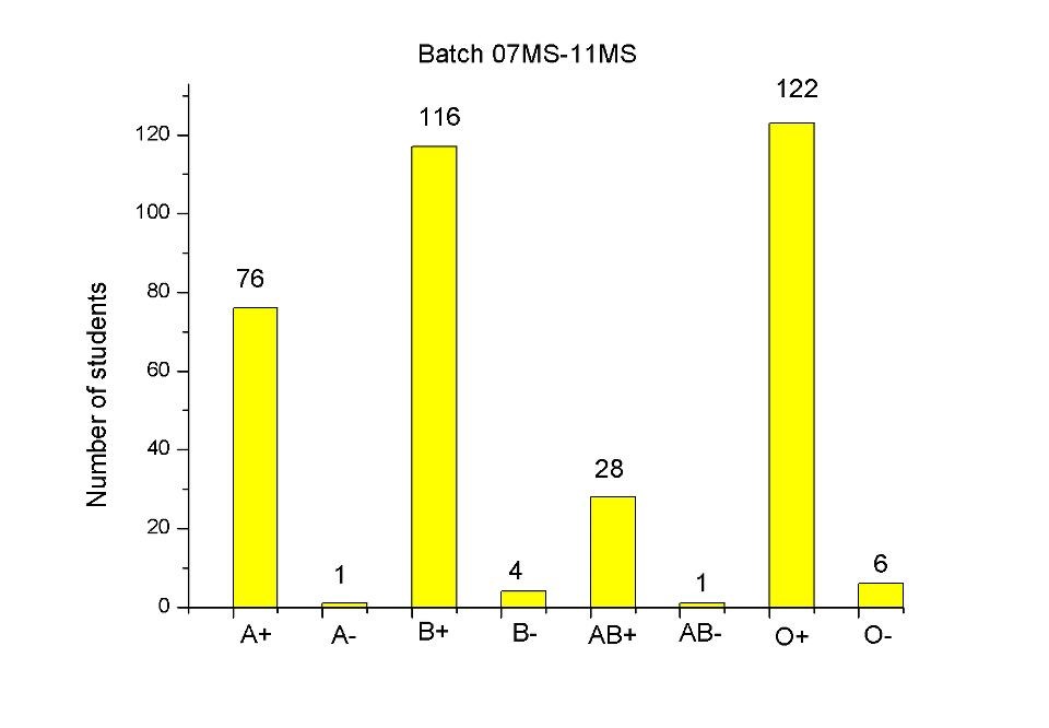 This spreadsheet contained the blood types of the Masters students across five batches (‘07-‘13). With this information he made a nice little bar diagram of the frequency distribution of blood types, which I lift here: