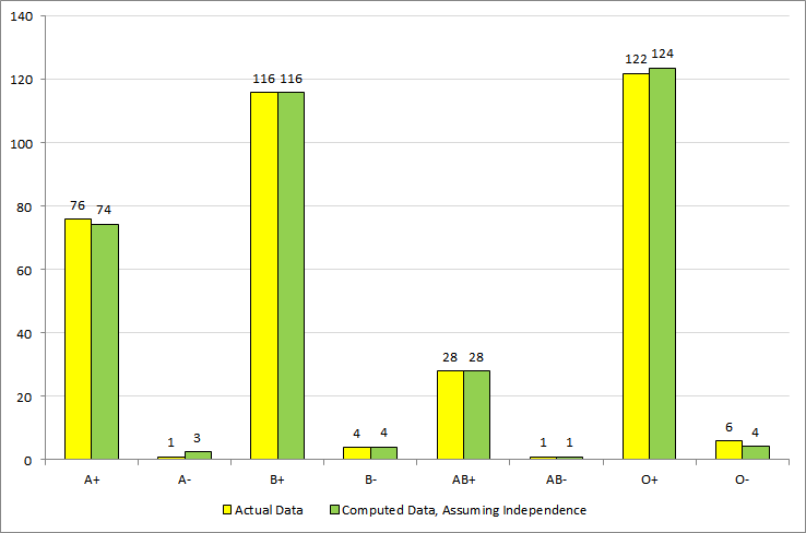 When I looked at this graph, what I noticed first was that this contains the distribution across both the antigen type (A/B/AB/O) and the Rh factor (+/-). It struck me that it may be possible by constructing a contingency table to check whether these two properties are independent of each other.