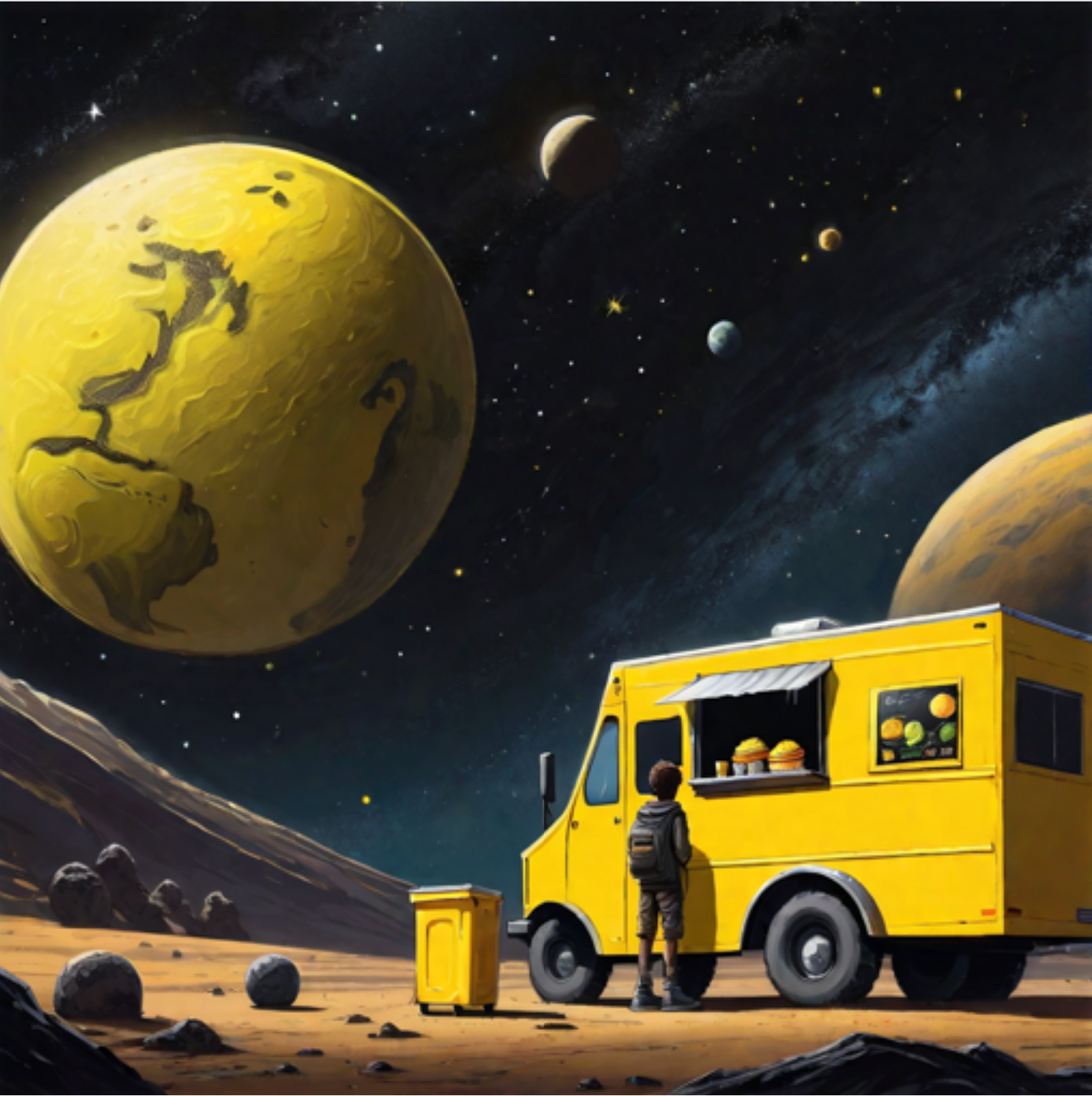 One evening as I stopped at his truck, he asked me, ‘Hey professor, is this true?’, and handed me a square paper across the counter. It was a crayon drawing of the blue-green planet earth and the sun in very black space. A white tail was coming out of the back of the earth like a comet, suggesting the arc of the earth’s motion. There was a brown man standing on the earth next to a yellow box on wheels, and a big red arrow was pointing at the man.